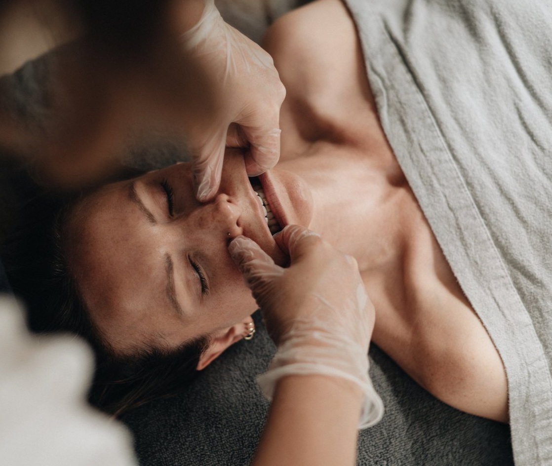 Buccal massage is an advanced therapeutic technique involving precise internal and external manipulation of the jaw and facial muscles. This treatment combines external massage with intraoral work, using gloved hands to access the deeper layers of the buccinator, masseter, and surrounding muscles both inside the mouth and along the jawline.